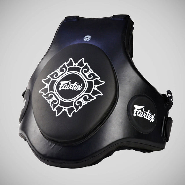 The Fairtex TV2 Trainers Vest Black/Gold is designed to help you simulate a real fight and train more effectively. The thick padding on the front and sides can absorb the full force of push kicks and body shots, reducing the risk of injury and providing a more realistic training experience.