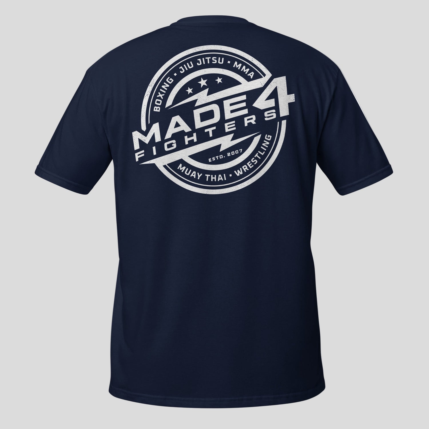 Back your discipline with confidence. The Made4Fighters Emblem T-Shirt in Navy features a bold circular back print showcasing the full combat lineup — from boxing and Jiu Jitsu to MMA, Muay Thai, and wrestling. Cleanly finished with a front chest logo and made from soft 100% cotton, this tee is made to move with you wherever the fight takes you.