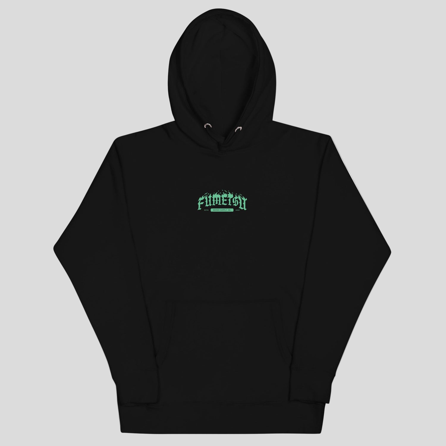 Power in every thread. The Fumetsu Oni Demon Hoodie in Black/Blue features a striking mint-blue flame logo across the back, layered over a ghosted demon mask design. The front keeps things sharp and clean with a centred chest logo in matching tones. Inspired by the Oni — a fearsome figure from Japanese folklore symbolising strength, protection, and raw spirit — this hoodie channels that same energy into your everyday kit. Built from a soft cotton-blend and finished with a roomy kangaroo pocket, it’s the hoodie that brings the heat—visually and literally.