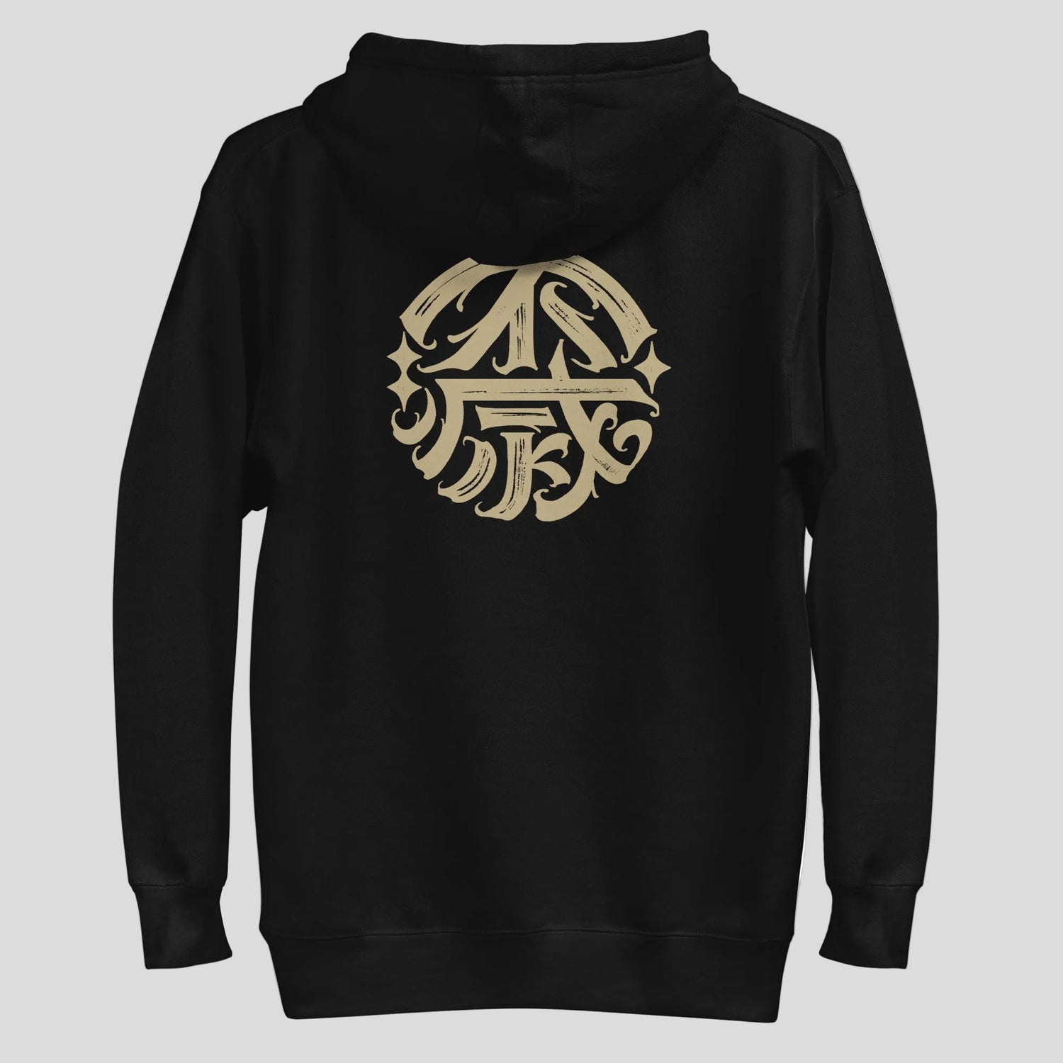Featuring the bold Fumetsu Ikigai calligraphic script on the chest and the striking Ikigai circular emblem across the back, both finished in muted gold on black.
