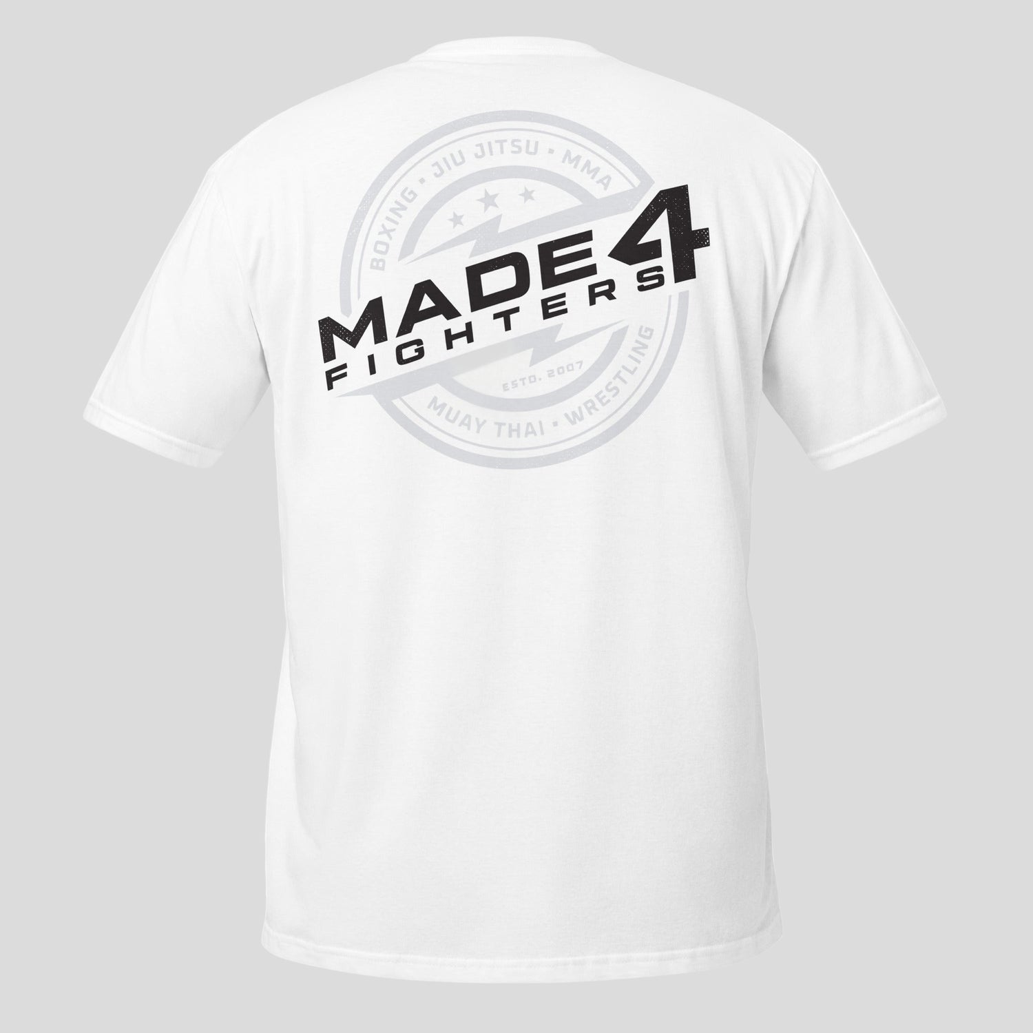 Classic colourway. All-out fight identity. The Made4Fighters Emblem T-Shirt in White/Grey/Black keeps it clean with a crisp white base and grey/black emblem graphics front and back. Featuring all five core disciplines—boxing, Jiu Jitsu, MMA, Muay Thai, and wrestling—this tee is built for those who rep the lifestyle in and out of training.