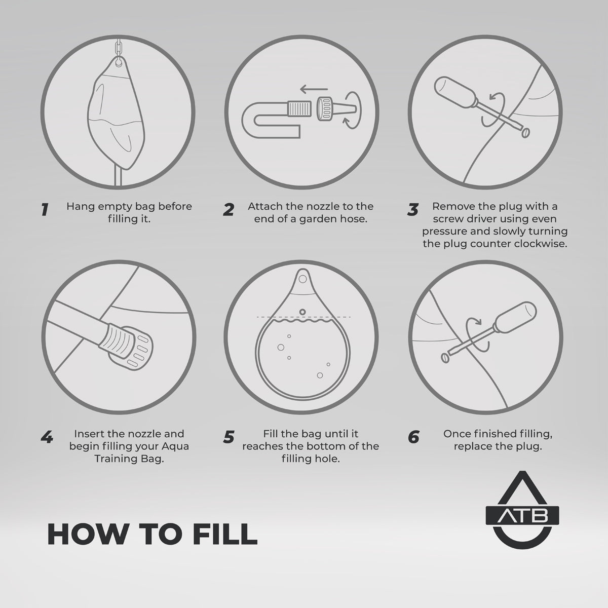 So füllen Sie Ihre Aqua Bruiser -Tasche. Wenn Sie beim Empfang zuerst Ihren Aqua -Bruiser -Beutel hängen, füllen Sie dann mit Wasser über Schlauch und Schlauchbefestigung. Andernfalls kann es für eine Person etwas schwer sein, zu heben. Wenn sich Ihr Aqua -Bruiser -Beutel zu hart anfühlt, lassen Sie etwas Wasser raus und wenn sie sich zu weich anfühlt, fügen Sie mehr Wasser hinzu.