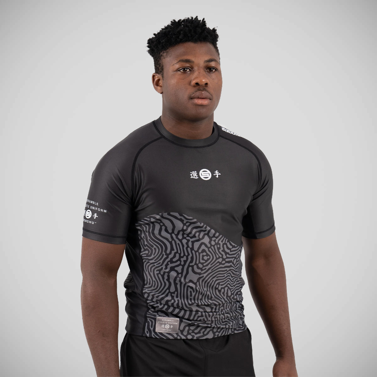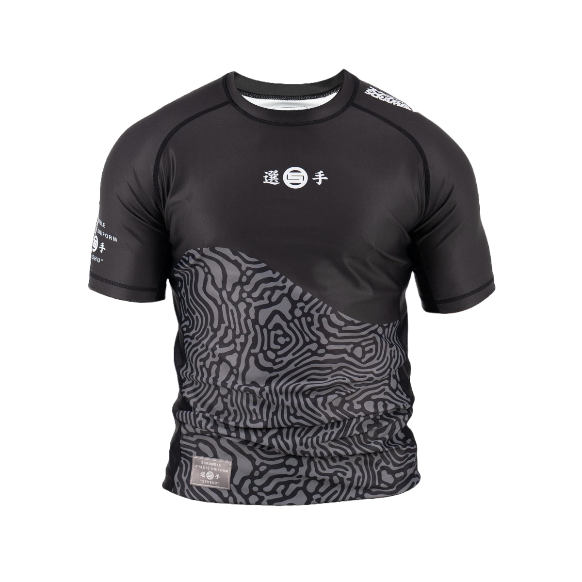 Un elegante rediseño del protector de erupción Surhu '24 de Surhu '24 presenta una marca senshu atenuada y un patrón gris tonal abstracto meticulosamente aplicado.