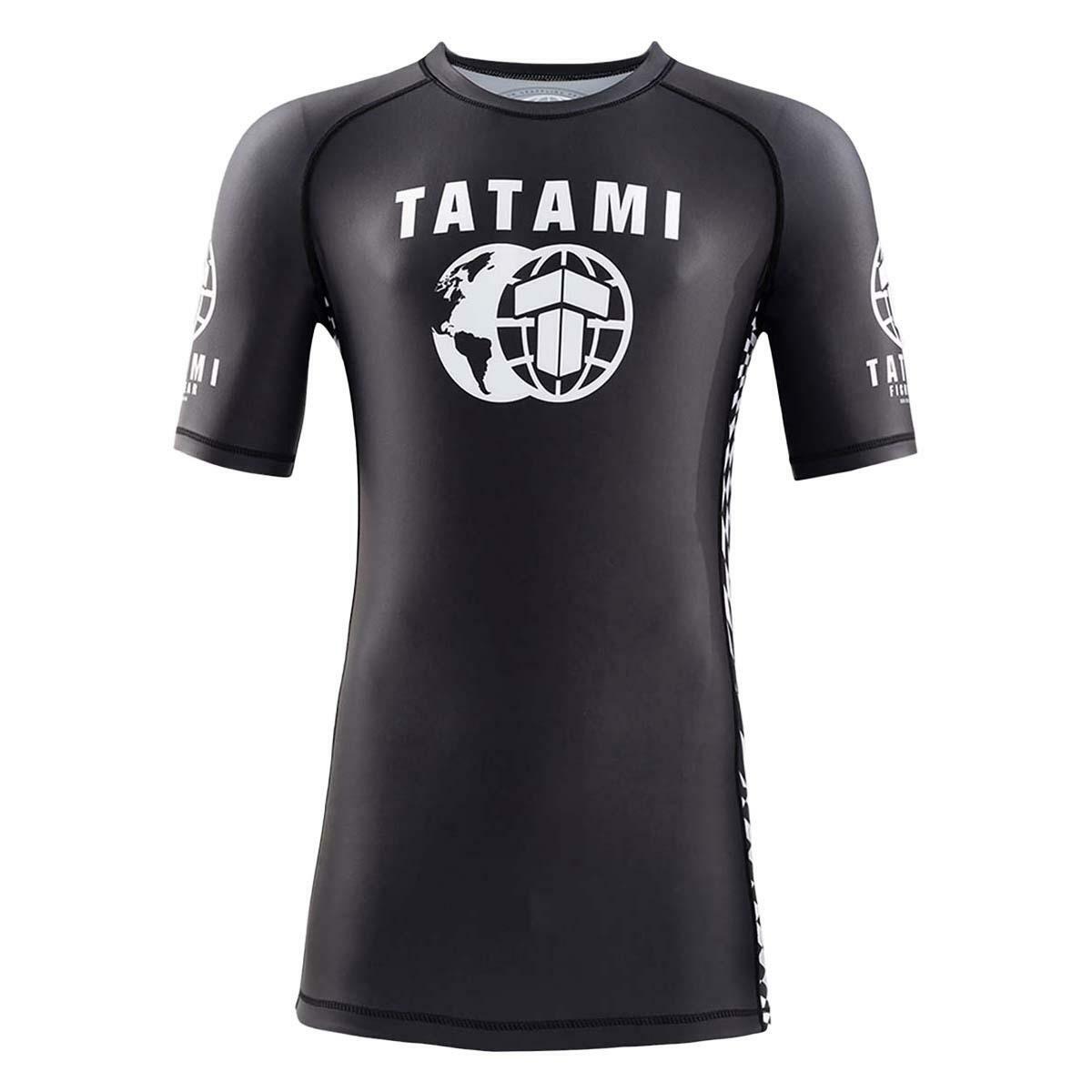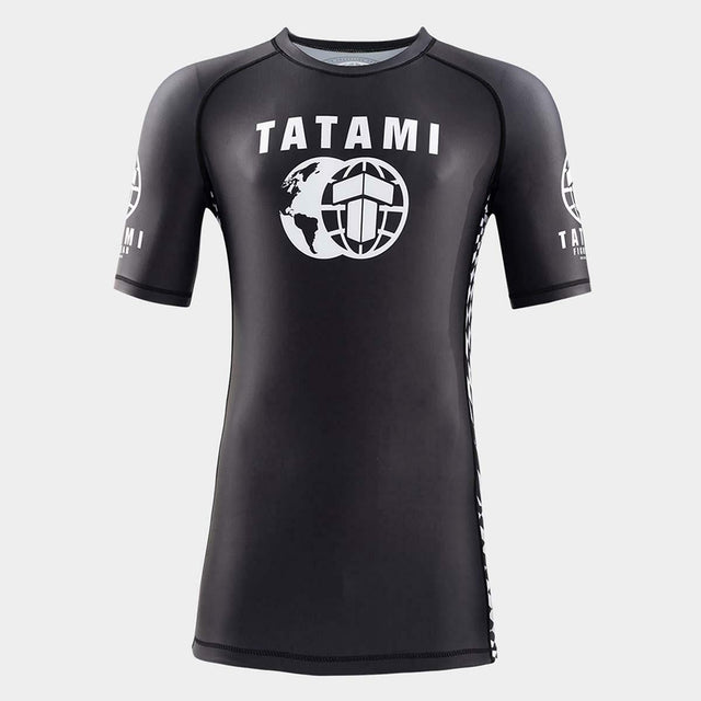 La sarpullida de manga corta Tatami Raid es negra con logotipos/diseños blancos y logotipos de tatami presentados en la parte delantera, espalda y mangas.