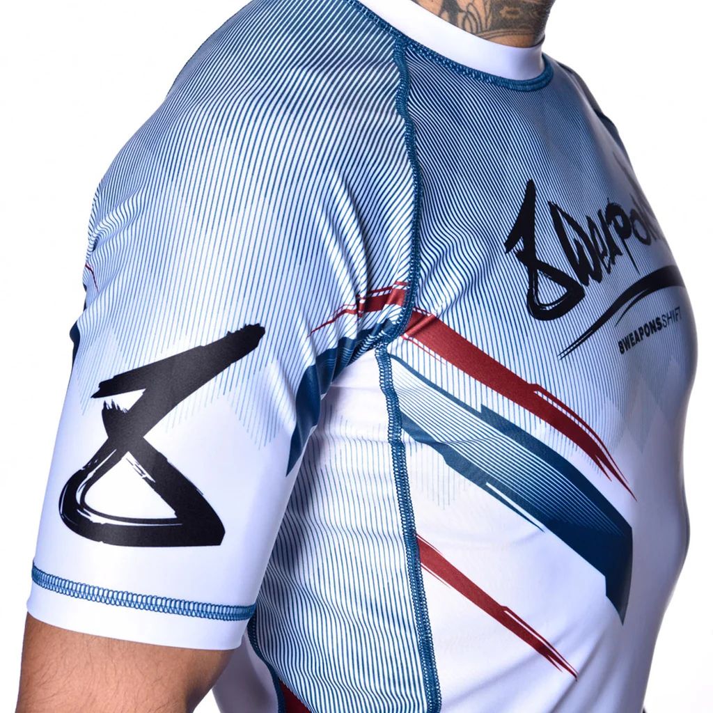 Entrenar sin compromiso en el 8 Weapons Guardia de erupción de cambio - blanco/azul marino/rojo. Disponible ahora en Made4Fighters.