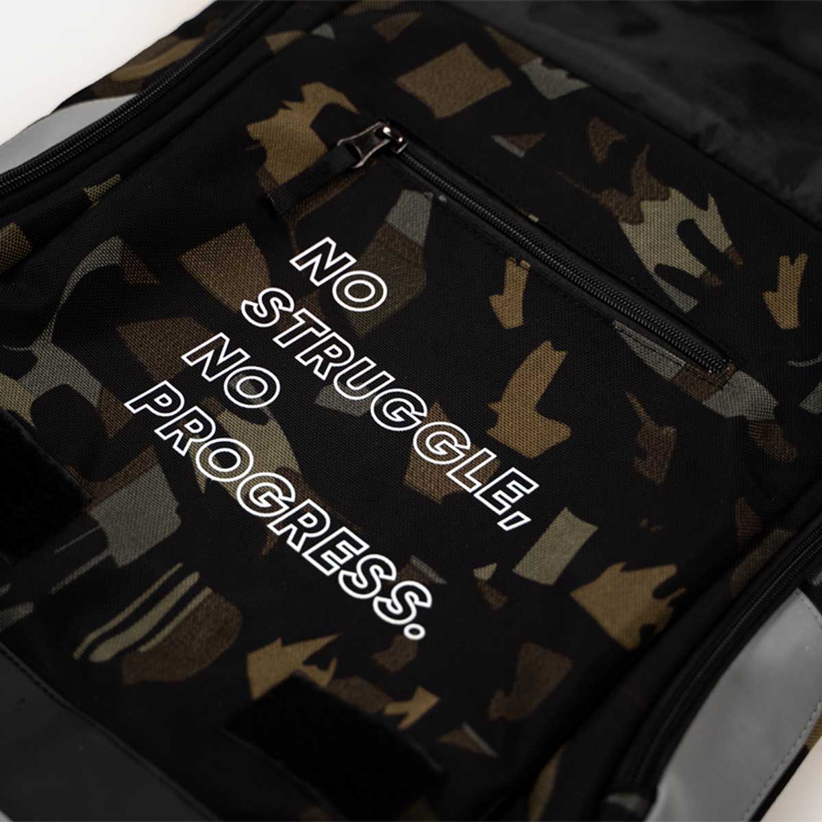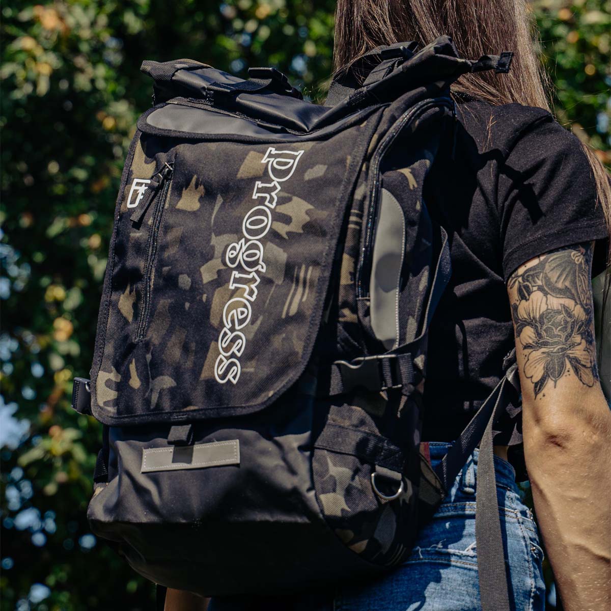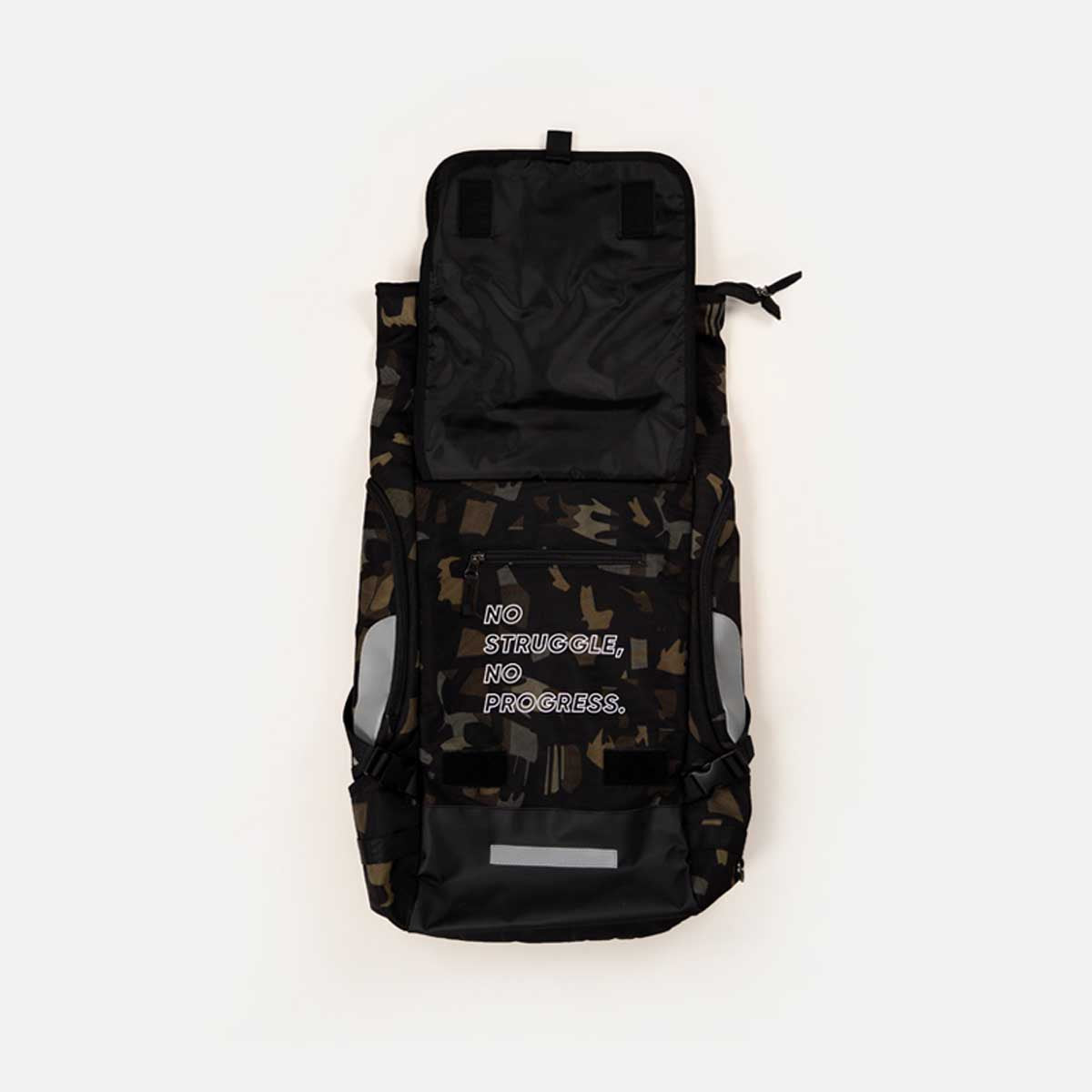 हमारा पहला बैकपैक, ब्लैक या कैमो में उपलब्ध है।