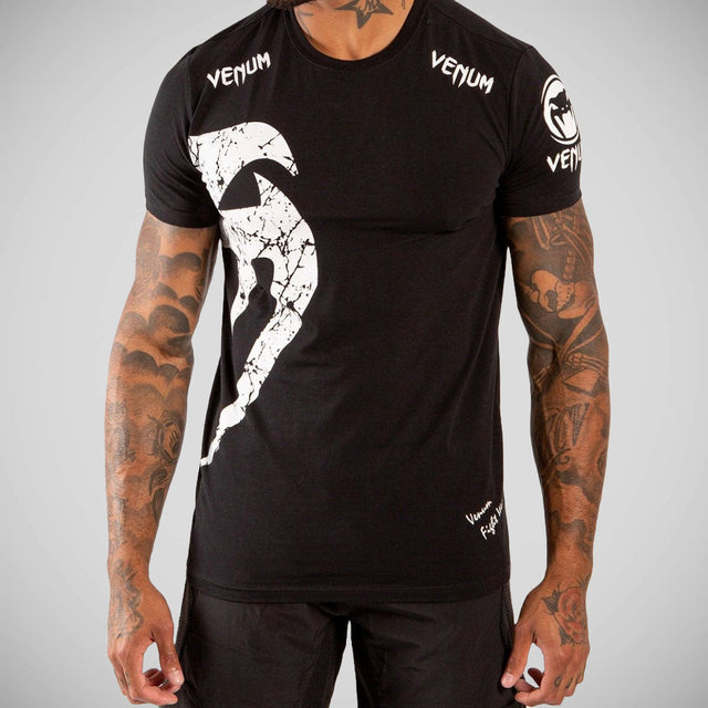 この驚くべき衣服を着用した勝利したUFC戦闘機の力と攻撃を導く準備をします。黒/白の強力で攻撃的なデザイン Venum ジャイアントメンズTシャツは、支配と大胆不敵の声明です。