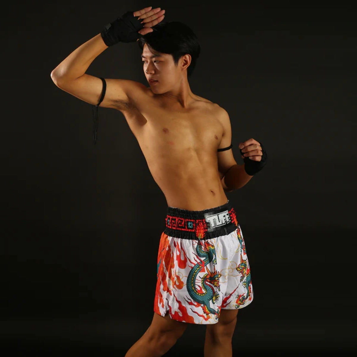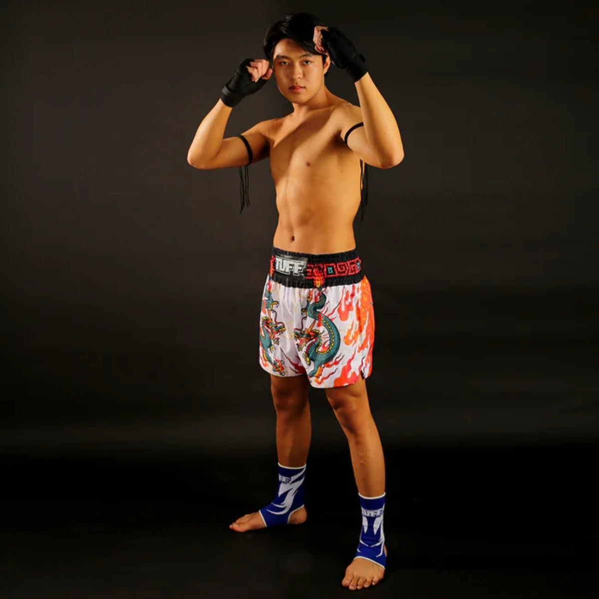 Blue Dragon Muay Thaiショートパンツを添えたTuff Sport MS622 Whiteを紹介します。 タイの武道の中心地で正確に手作りされた手作りで、彼らは単なるショートパンツではありません。彼らは声明です。