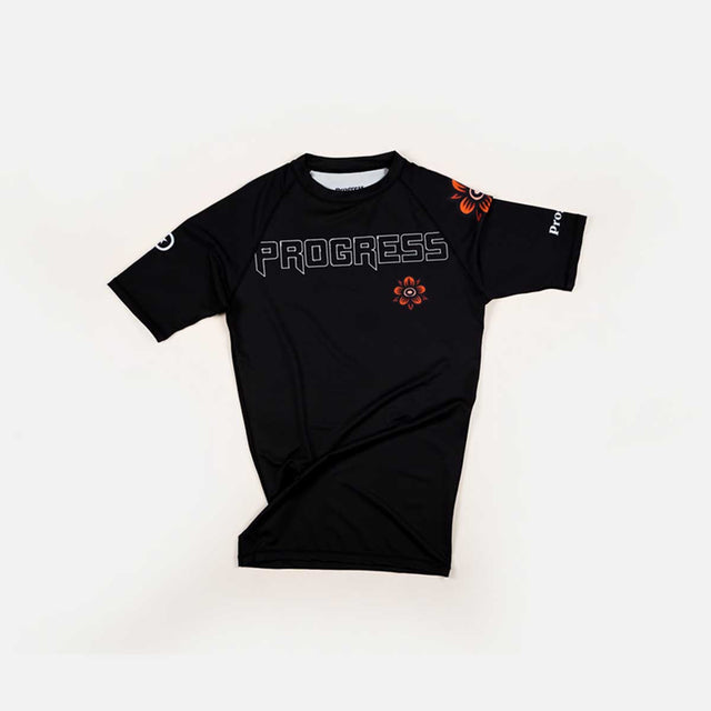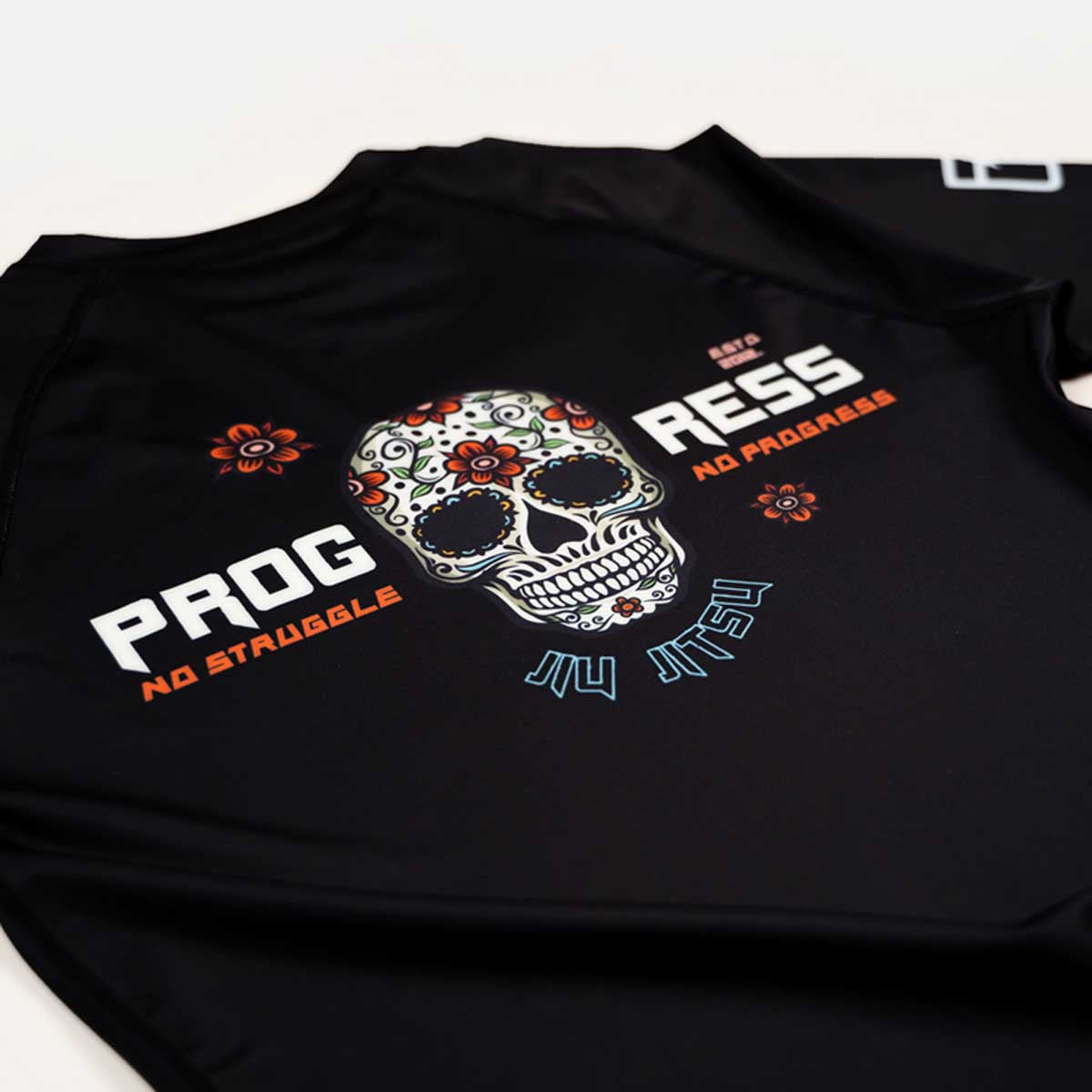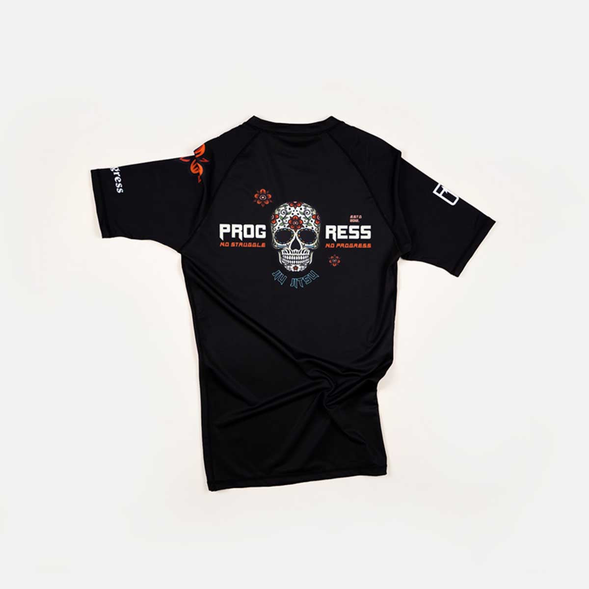 ラッシュガードの背面にある大きな進歩カラベラ(装飾的な頭蓋骨)。