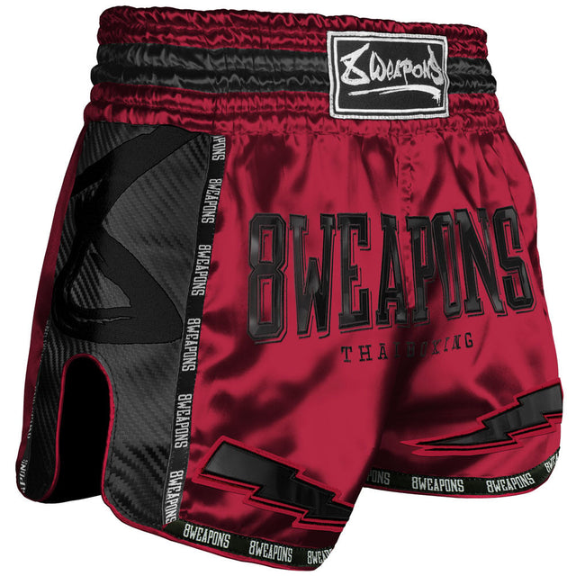 De 8 våpnene karbon muay thai kort er moderne shorts for thailandske boksing. Fortsettelse av de mest vellykkede 8 våpenshortsene. 8 våpenslogoen på fronten er ferdig med et skinnende imitasjonsskinn.