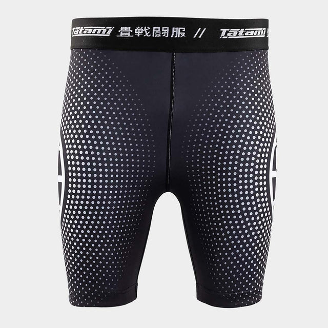 Tatami Shockwave Vale Tudo -shorts har en svart base med hvite logoer/design. Shockwave -designet består av hvite flekker rundt Tatami T -logoen.