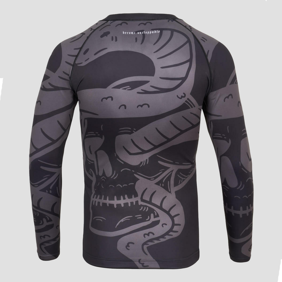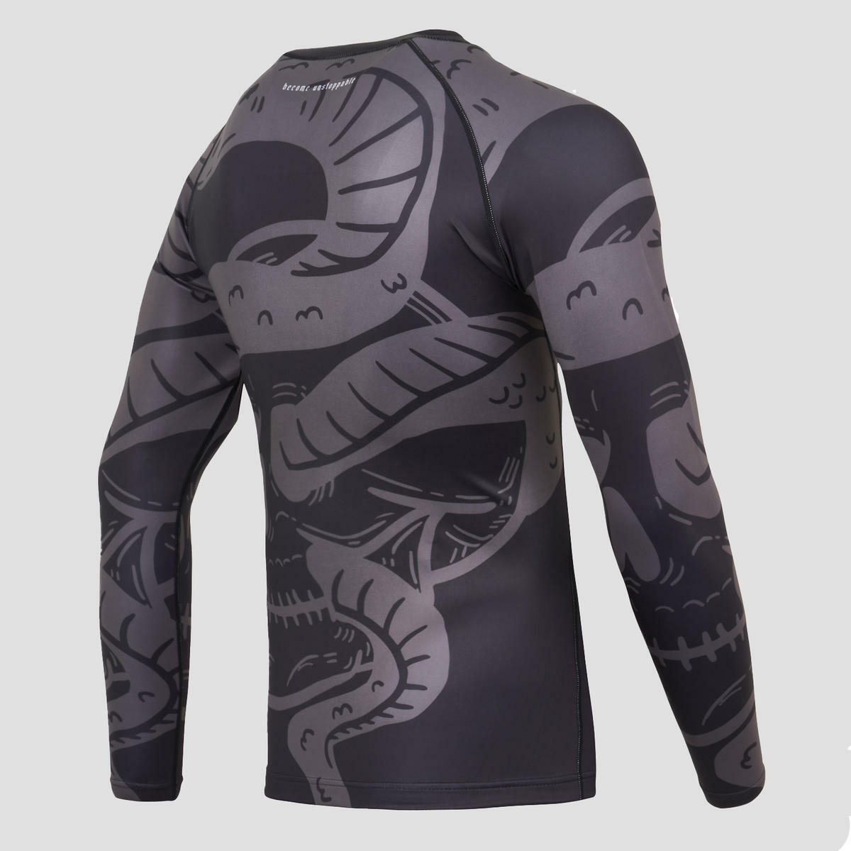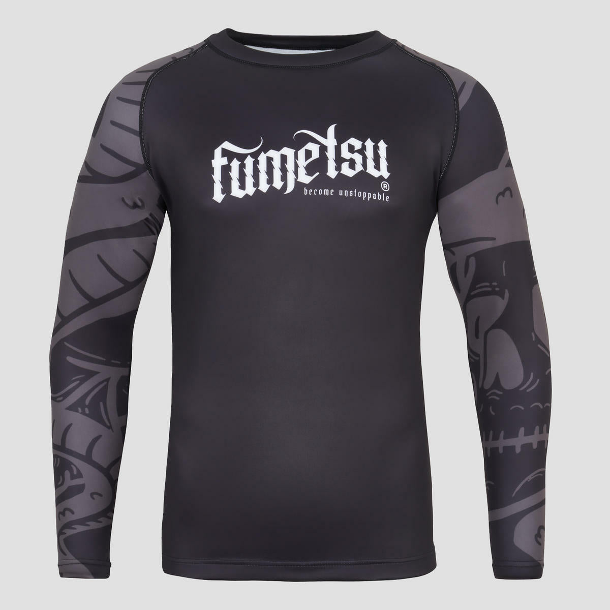 Dominate the competition with the Black Fumetsu Snake Eyes Long Sleeve Rash Guard. Designed to empower you during training and fights, this rash guard features captivating fully sublimated graphics that make you the center of attention.