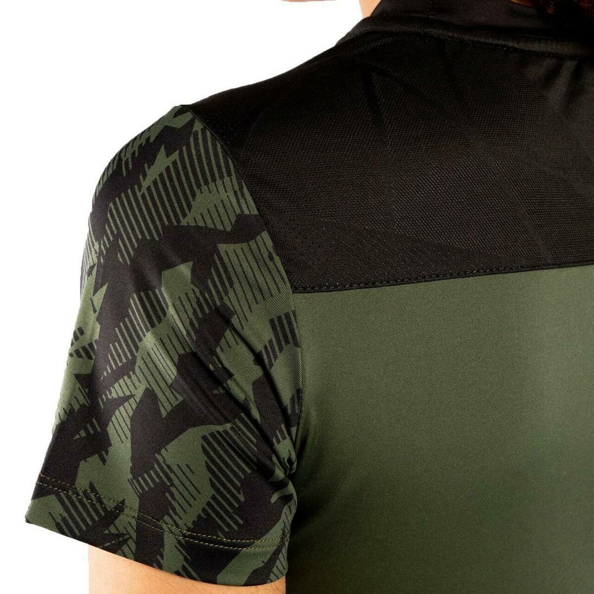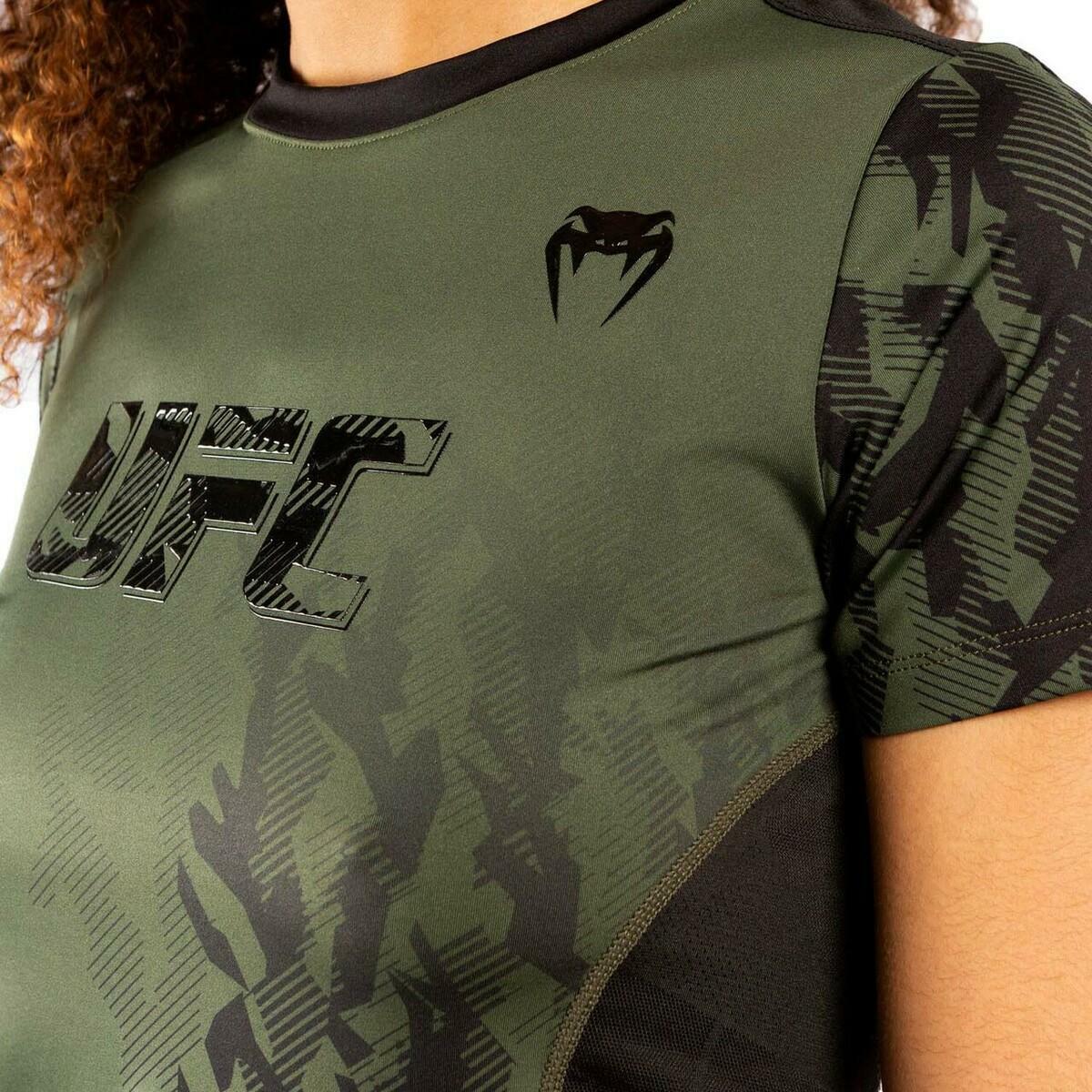 The Khaki Venum UFC Authentic Fight Week Women's Dry Tech T-Shirt is a performance shirt specifically designed to meet the needs of world-class athletes. Its bi-material construction is flexible and durable, with the goal of maximum mobility and comfort regardless of the activity. Its technology aids the wicking of perspiration from the skin and allows the shirt to dry quickly. The Venum Fight Week Dry-Tech t-shirt is the result of a collaboration between Venum and the world's leading mixed martial arts organization, the UFC.