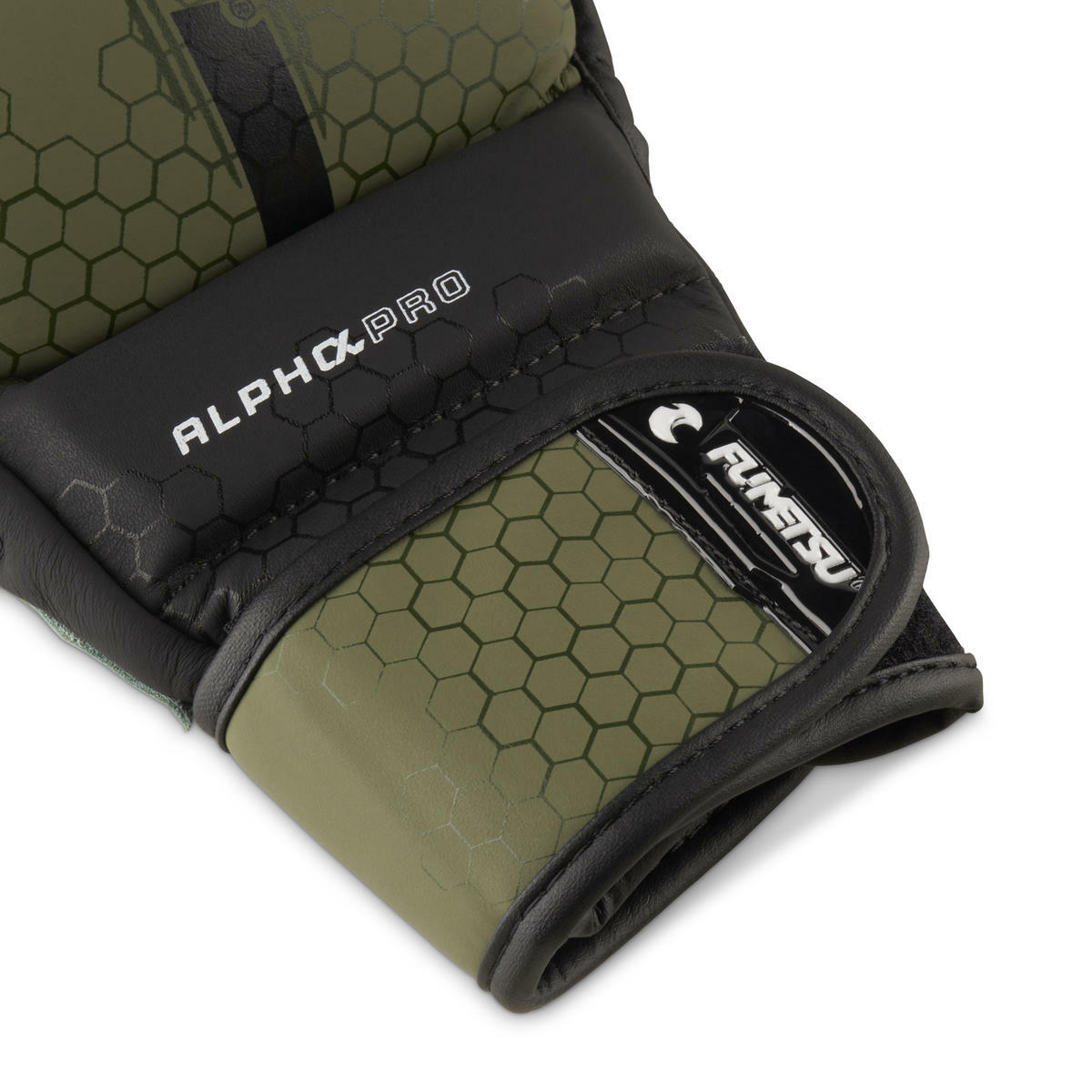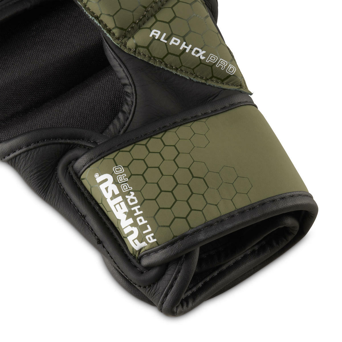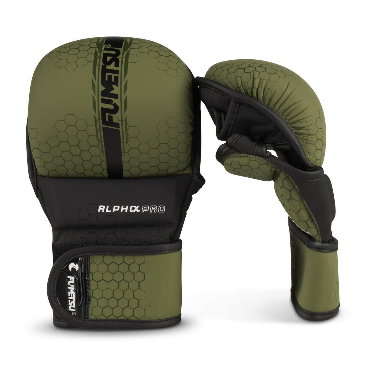 The Olive Green/Black Fumetsu Alpha Pro MMA Sparring Gloves are hand-crafted from premium cowhide leather and offer unmatched quality and durability. They have an open palm design with a double padded striking area providing maximum comfort and protection, while the hook and loop closure ensures a secure fit.