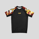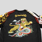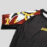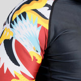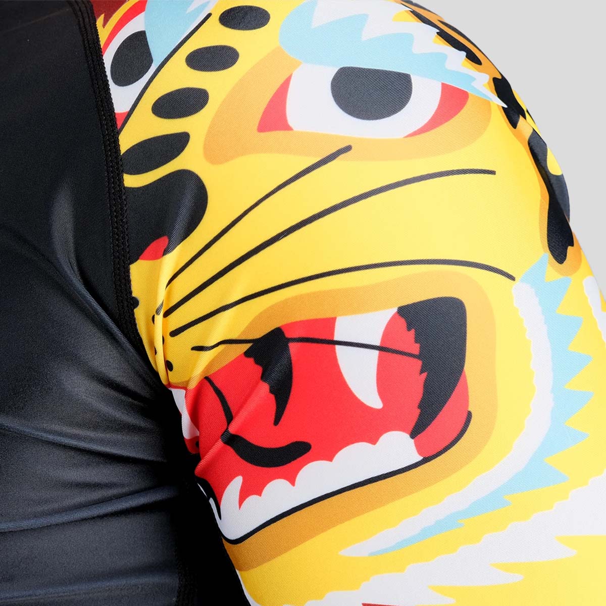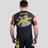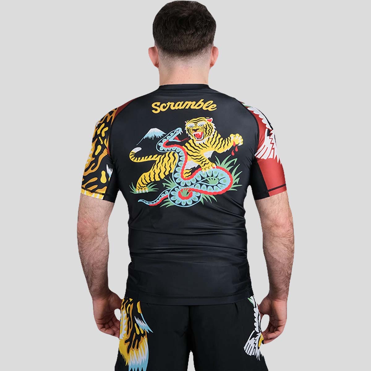 The Scramble Sukajan Rashguard – Short Sleeve is a limited-edition piece celebrating 15 years of Scramble's innovation in jiu-jitsu gear. This rashguard features bold, colourful artwork by London-based tattoo artist and jiu-jitsu practitioner Kieran Hoohar, showcasing traditional motifs like tigers, snakes, jaguars, and eagles in his signature style.