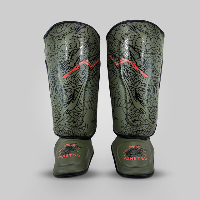 A fixação dupla de gancho e loop os mantém firmemente no local durante o trabalho de sparring ou pad, para que você possa se concentrar totalmente no seu desempenho sem ajuste constante. Terminados com obras de arte em negrito de dragão desenhado à mão e construídas a partir de couro sintético durável para veganas, esses guardas de canela combinam função e estilo impressionante em igual medida. Ideal para sessões de Muay Thai, MMA e Kickboxing.