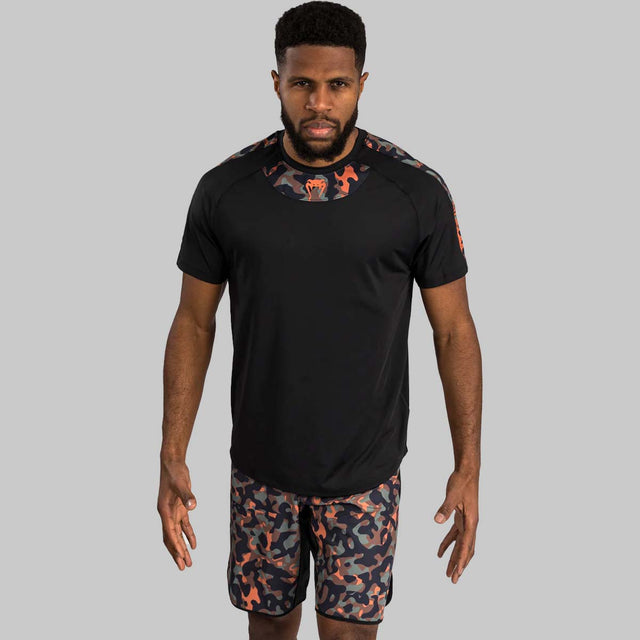 Inspirado na intensidade rápida e decisiva da guerra na selva, o Venum A camisa de tecnologia seca da Jungle Ops em Canyon Camo é projetada para atletas que exigem desempenho e estilo. Criados a partir de tecido leve e elástico, esta camisa garante movimento irrestrito e conforto durante sessões de treinamento intensas. Os materiais de tecnologia seca afastam a umidade, mantendo você fresco e seco enquanto você empurra seus limites. Apresentando um design de camuflagem tropical com laranja em negrito Venum Logos no peito e na manga, esta camisa faz uma declaração dentro e fora da academia.