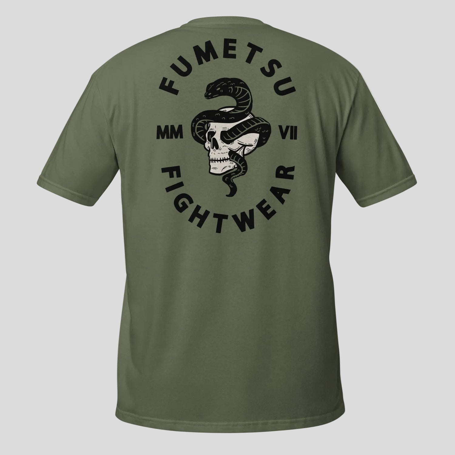 This khaki tee showcases the hand-illustrated snake and skull graphic across the full back, framed by the Fumetsu Fightwear circular logo, with a matching chest graphic and gothic-style typography throughout.