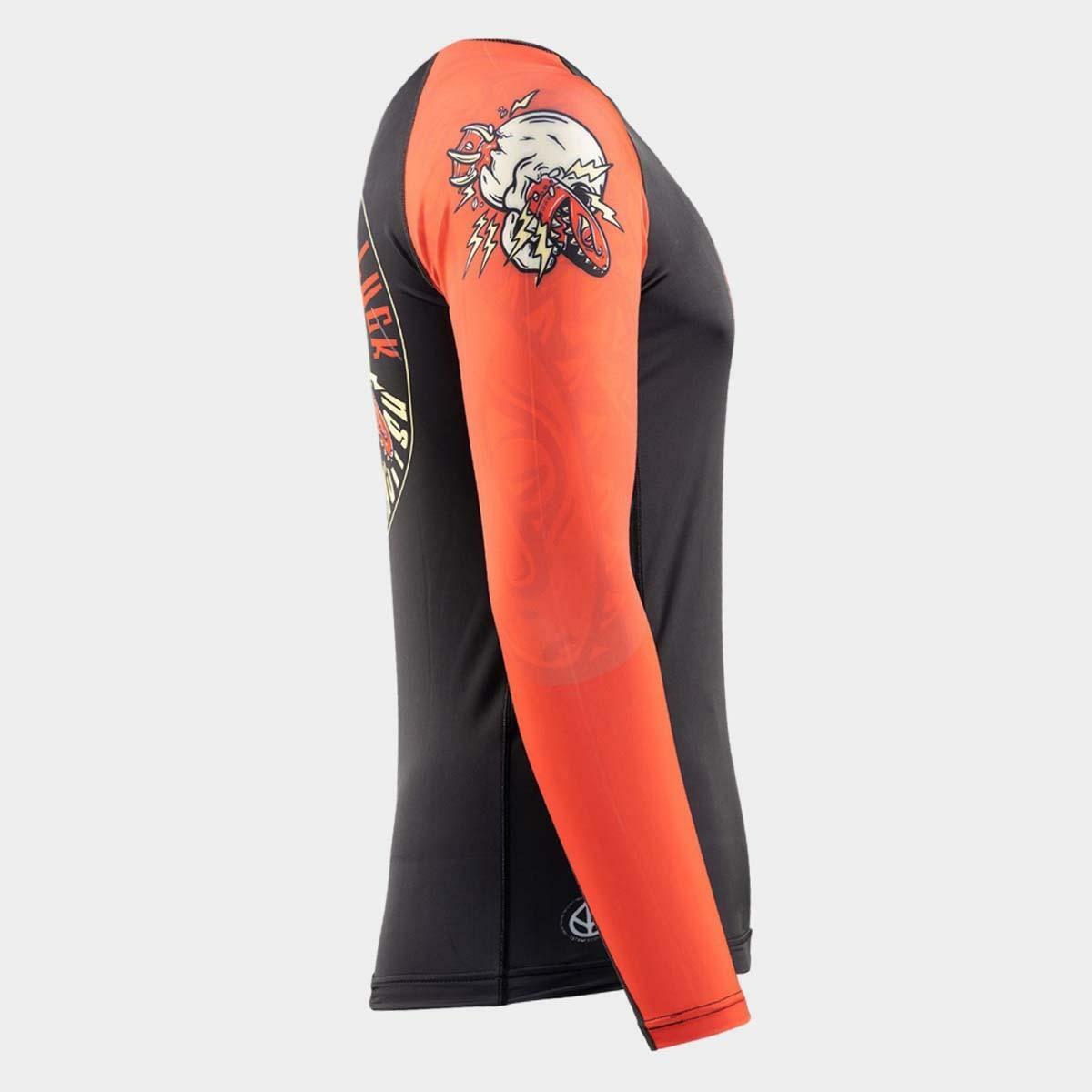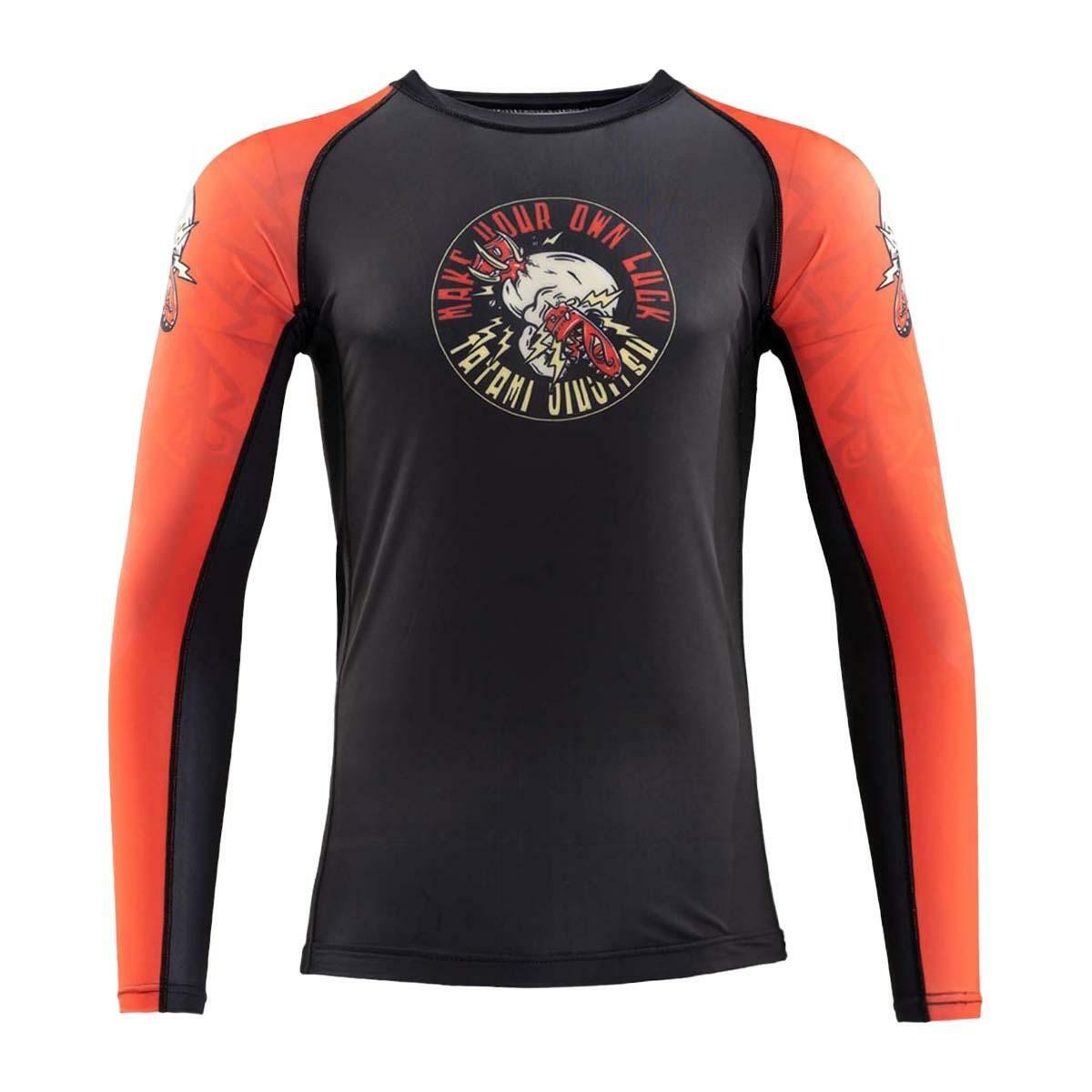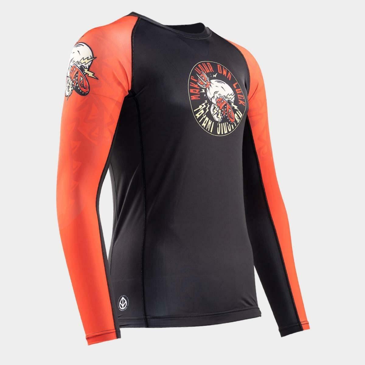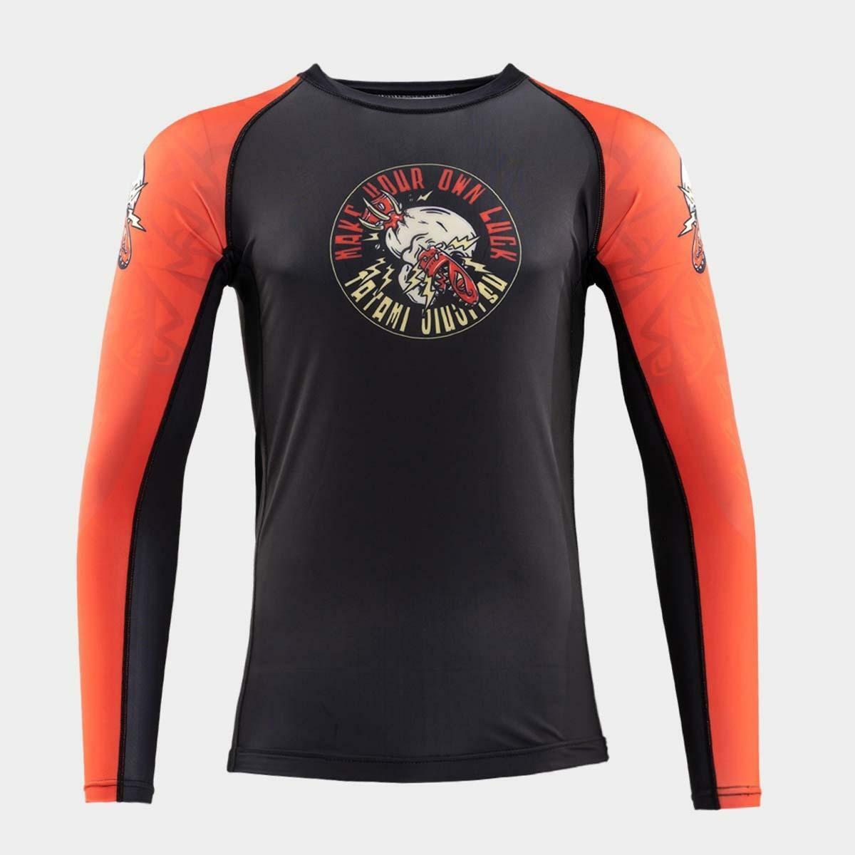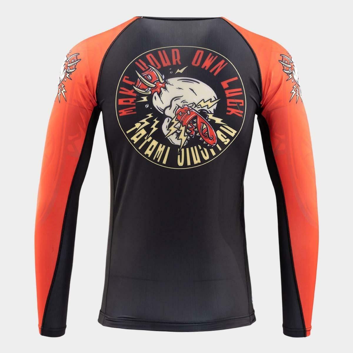 Tatami Lucky Rash Guard are o bază neagră pe corp cu mâneci lungi roșii contrastante. Există un design „Faceți -vă propriul noroc” pe față și înapoi.