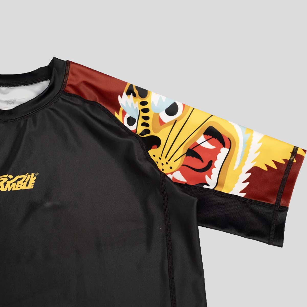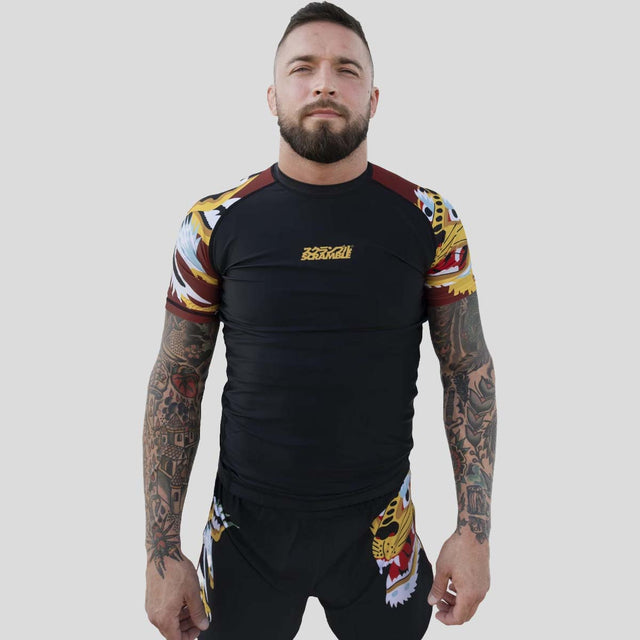 Scramble Sukajan Rashguard-короткий рукав-это пьеса с ограниченным средством, посвященная 15-летним инновациям Scramble в Giu-Jitsu Gear. В этом Rashguard есть смелые, красочные произведения искусства от лондонского татуировки и практикующего Jiu-Jitsu Kieran Hoohar, демонстрируя традиционные мотивы, такие как тигры, змеи, ягуары и орлы в его фирменном стиле.