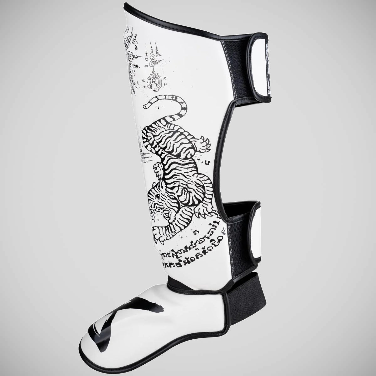 Güvenli bir uyum için, boks eldivenleri giyerken bile kolayca açılabilen ve kapatılabilen iki geniş kanca ve döngü bağlantı elemanı ekledik. Ek olarak, iki elastik bant koruyucuyu ayağın etrafında yerinde tutar. Ayrıca, ayak bölümüne ek esneklik sağlayarak bir neopren ek ile InsteP'e geçişi geliştirdik. 8 silah shin gardiyanları yüksek kaliteli sentetik deriden üretilir ve bir çift olarak gelir.