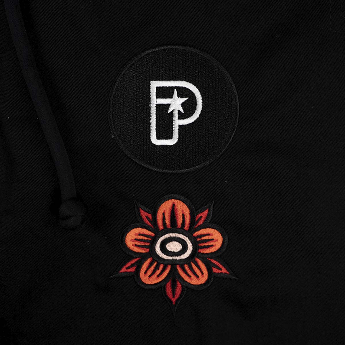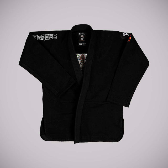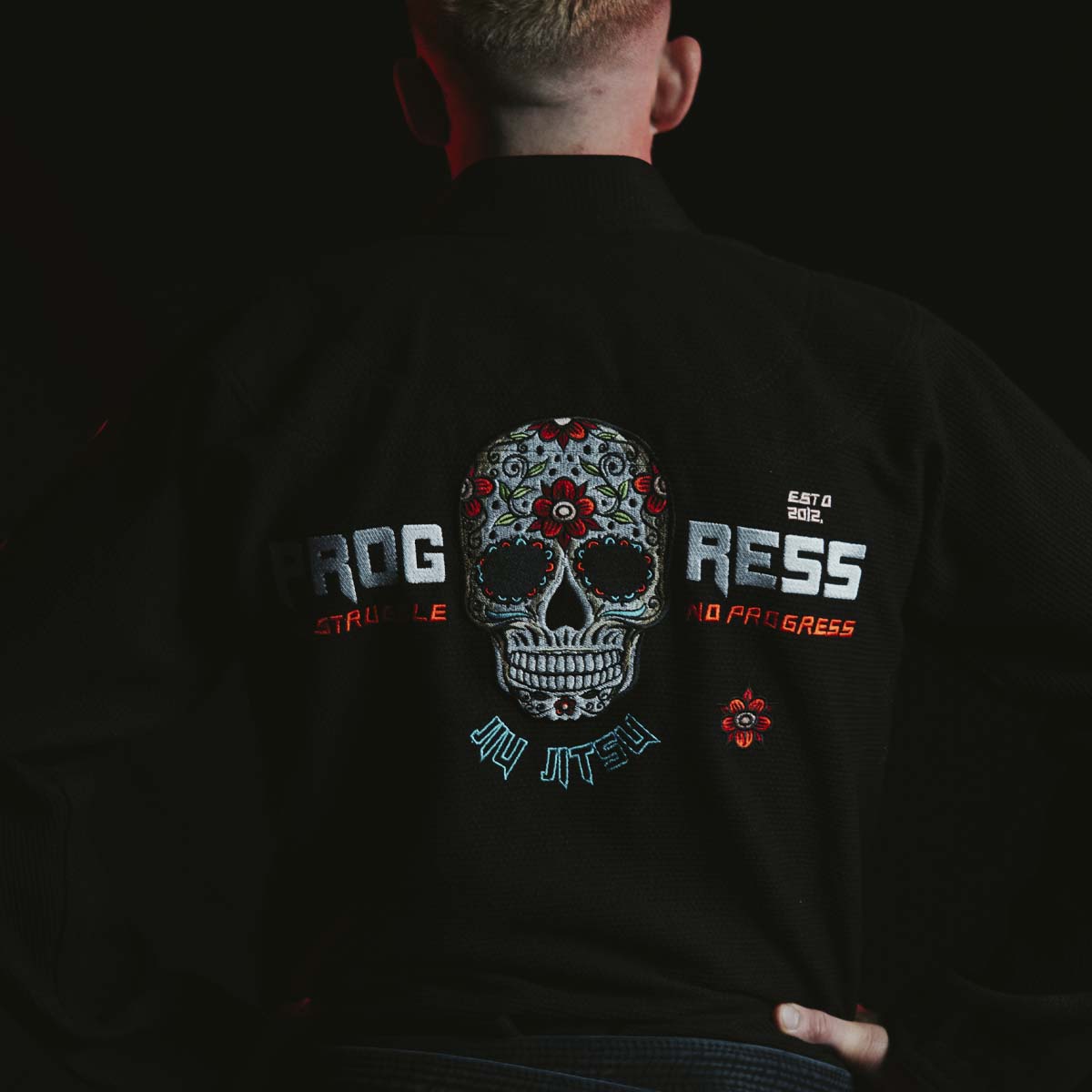 Великий прогрес Калавера (декоративний череп) на задній частині Рашгуарда, розроблений прогресом Сема, для його любові до барвистої прохолодної мексиканської культури.
